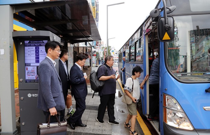 [세계로컬신문 오영균 기자] 권선택 대전시장이 22일 아침 시내버스를 타고 출근하고 있다. 대전시는 지난해 11월 이후 중단했던 ‘투투(Two-Two) 버스데이’를 대중교통 이용 활성화를 위해 8월부터 다시 추진키로 했다.
