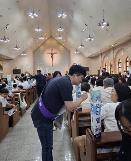 지난 5월 31일, 진천군 배티성지에서 열린 충북 지역 천주교 교구 행사장(‘청주교구 찬미 예수의 날’)에서 청주공항 민간항공 노선 신설을 촉구하는 서명운동이 펼쳐졌다.