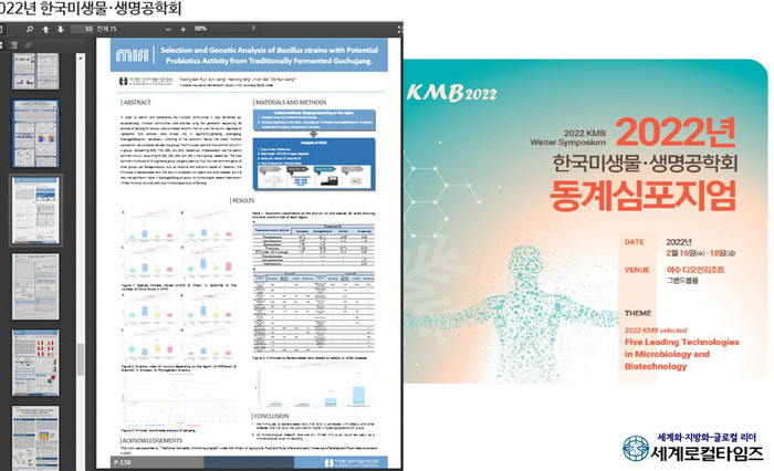[세계로컬타임즈 조주연 기자] 전북 순창 발효미생물산업진흥원이 2022년 한국미생물생명공학회 학술대회에서 농림축산식품부가 주관하는 ‘2021 장류 기능성 규명(안전성 모니터링)사업’ 관련 연구성과를 발표했다.