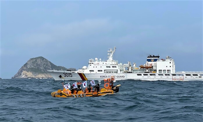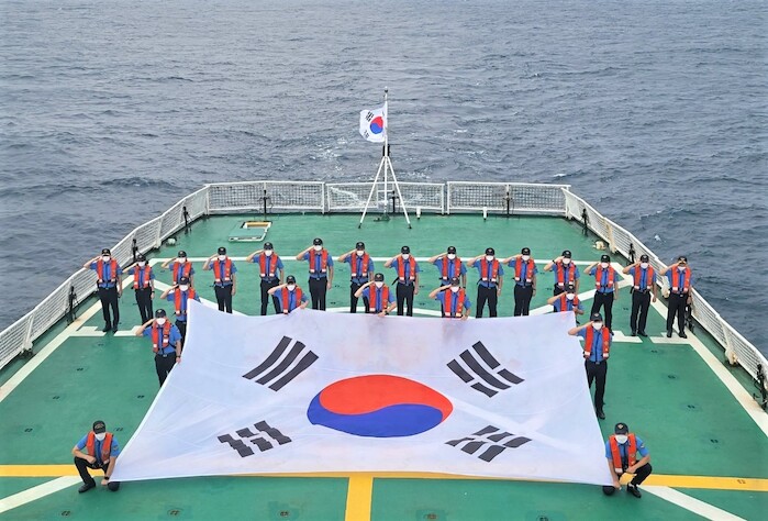이어 배타적 경제수역(EEZ)에서 해상경비 임무 중 우리나라 23개 영해기점 중 하나인 신안군 가거면 소국흘도 앞 해상에서 고속단정이 태극기와 함께 파도를 가르는 퍼포먼스를 이어가며 해양영토 수호 의지를 다졌다.