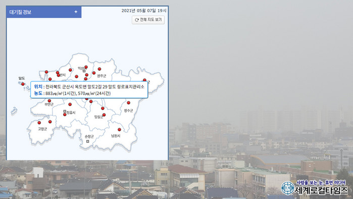 [세계로컬타임즈 조주연 기자] 현재 황사 영향으로 전북 일부지역에 7일 20시 30분 기준으로 황사 ‘경보’가 발표되고 재난 문자가 발송됐다.