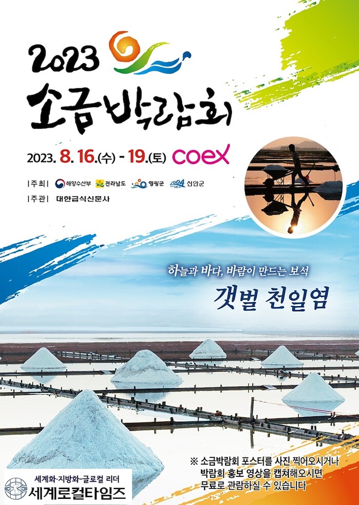 [세계로컬타임즈 김명진 기자] 신안군은 서울 코엑스에서 오는 16일부터 19일까지 “하늘아래 다양한 소금과 만나다”라는 주제로 ‘2023 소금박람회’를 개최한다.