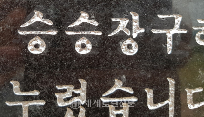 | ▲ '욱일승천'이라고 각인됐던 자리에 메꿔진 표시가 희미하게 보이고 그 위에 '승승장구'라는 글자가 각인돼 있다. |