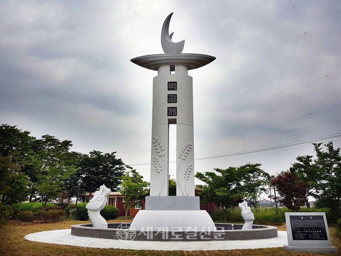 "국가사적 제111호 김제 벽골제는 면적 8940경 95부의 농수원이었습니다. 벼고을인 이곳에 둑을 쌓으면 흉년이 없다는 선인들의 혜안으로 일궈낸 성지입니다. 청룡 백호의 용맹, 단양낭자의 헌신적 사랑 설화 속에 모악산 상두산에서 흐르는 물 모아, 벼 한 포기, 쌀 한톨한톨의 자양분이 되게 하였습니다. 이 생명수와 수리 도작인들의 지혜가 김제 만경의 황금들녘을 만들어 냈고 농자천하지대본의 표본을 이뤄냈습니다. 그 역사, 뜻 깊어 김제지평선축제로 승화된 뒤 해마다 승승장구 하더니 마침내 우리나라 처음으로 5회 연속 대한민국 대표축제, 글로벌 육성축제로 큰 영광을 누렸습니다. 이를 영원토록 기리고 빛내고자 소설 아리랑의 배경인 죽산 출향인으로서 자랑스런 마음으로 이 탐을 세웁니다"
