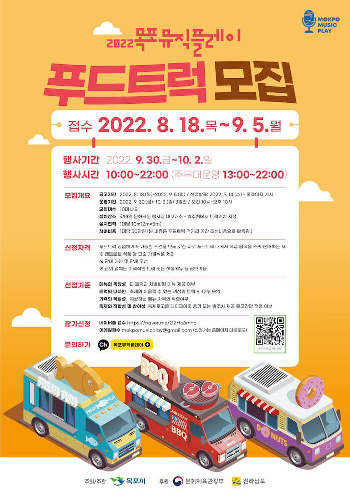 참가신청은 목포뮤직플레이 홈페이지(행사안내-공지사항)에서 신청서를 다운받아 오는 9월 5일까지 네이버폼 또는 이메일로 접수하면 된다.