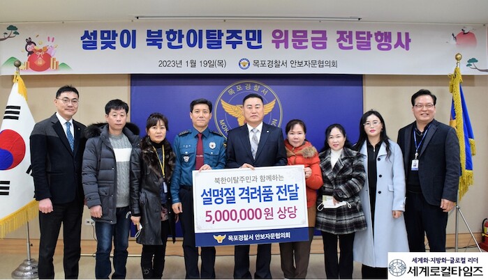 [세계로컬타임즈 김명진 기자] 목포경찰서와 안보자문협의회회장 안광성는 지난 19일 설 명절을 맞아 목포와 신안에 거주하는 탈북민들을 위한 위문금 전달식을 목포경찰서 이준규홀에서 가졌다.