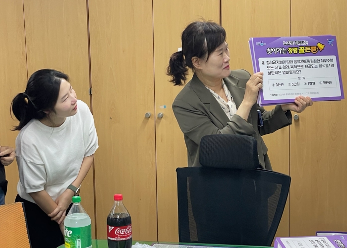 이번 시책은 감사관실 직원과 노조임원 등이 함께 대상부서에 직접 방문해 퀴즈를 통한 청렴홍보․교육을 실시하고 정답자에게 청렴굿즈 등을 포상하는 방식으로 운영되며, 노조에서 지원하는 ‘부서 간식데이’와 병행 실시하여 부서내 전직원 청렴‧소통 및 화합의 장을 마련하는 등 청렴실천 분위기 확산과 내‧외부 청렴도 제고를 위해 마련됐다.