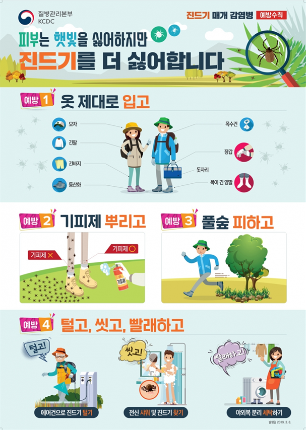 진드기 매개 감염병은 가을철에 주로 발생한다고 알려져 있으나, 중증열성혈소판감소증후군(SFTS)를 매개해 살인진드기로 알려진 작은소피참진드기의 활동은 4월부터 11월까지 지속되므로 연중 각별한 주의가 필요하다.