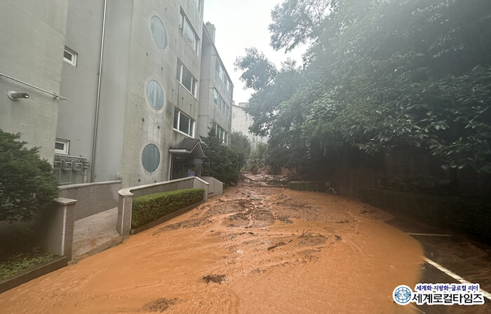 군산시에 따르면 이날 오후 해당 연립주택 인근에서 많은 양의 빗물과 함께 토사가 흘러내려와 입구를 뒤덮었다.