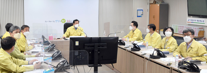| ▲ 윤화섭 시장 등 안산시 관계자들이 중앙재난안전대책본부(중대본) 영상회의에 참가하고 있다.(사진=안산시) |