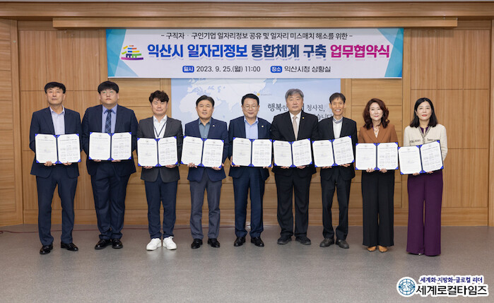 25일 익산시는 지역 구직자 및 구인기업들에게 폭넓은 일자리정보 제공을 위해 시청 상황실에서 9개 기업·지역대학·직업훈련 전문기관과 일자리정보 통합체계 구축을 위한 업무협약을 체결했다.