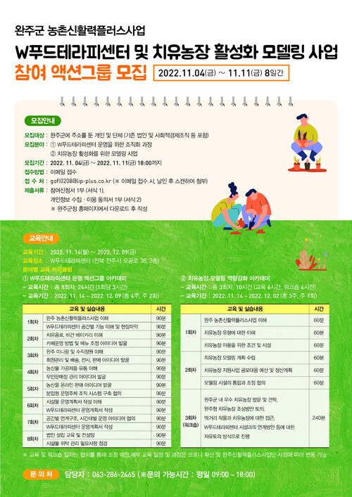 [세계로컬타임즈 조주연 기자] 전북 완주군이 오는 11일까지 ‘W푸드테라피센터 및 치유농장 활성화 모델링’을 위한 액션그룹 참여 단체를 모집한다.
