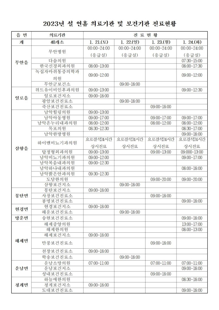 관내 지역응급의료기관인 무안병원은 응급환자 발생을 대비해 24시간 응급실을 운영해 비상 진료체계를 유지하고 관내 병.의원 및 보건기관 40개소와 약국 17개소도 지역별·일자별로 지정 운영된다.