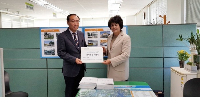 | ▲조재철 의원(오른쪽)이 대전시청을 방문해 홍성박 트램계획 과장에게 건의문과 1만 여명 서명서를 전달하고 있다. <사진제공= 중구의회> |