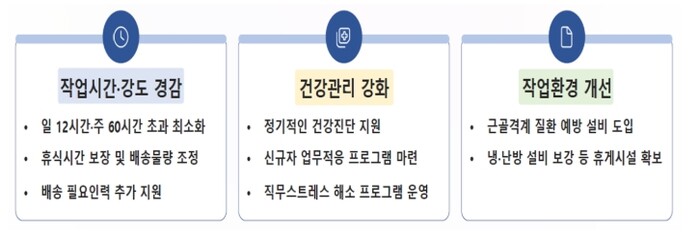 간담회에서 정부는 택배노동자 과로방지를 위해서는 선제적이고 체계적인 관리가 중요함을 강조하며, 작업시간과 휴게시간의 적정한 관리와 배송물량 증가에 따른 인력 지원, 건강진단 지원 및 신규자 업무 적응 프로그램 마련 등 건강관리 강화, 적절한 휴게시설 확보 등 작업환경 개선을 핵심 조치 사항으로 제시했다. 아울러, 추석 연휴 전‧후 현장 모니터링을 통해 현장 이행 상황을 살펴볼 계획이라고 밝혔다.