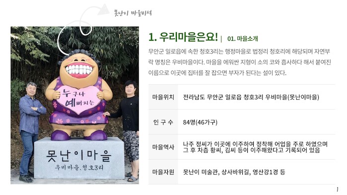 우비마을은 마을 자체적으로 못난이 파티, 음악회 등을 추진한 점, 행복 무안 수련마을 만들기를 시작으로 다양한 공모사업에 참여해 문화복지 마을이 되기 위한 힘찬 발걸음을 내딛은 점 등을 높이 평가받았다.