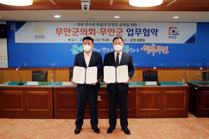 [세계로컬타임즈 박종현 기자] 무안군의회와 무안군은 지난 3일 무안군청 상황실에서 무안군의회 인사권 독립의 안정적 추진을 위한 업무협약을 체결했다.