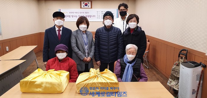 | ▲이배연 세계일보 중앙위원회 중앙위원이 수의 2벌을 전달한 후 기념 촬영을 하고 있다. (사진=이효진 기자) |