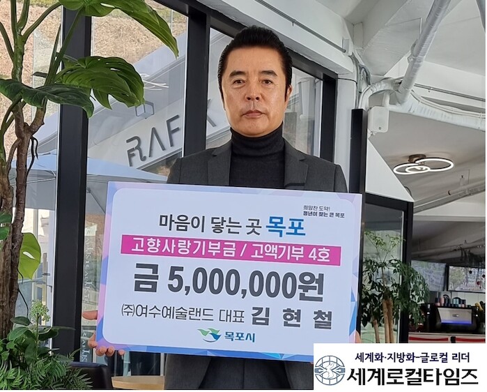 [세계로컬타임즈 김명진 기자] ㈜여수예술랜드 김현철 대표가 지난 22일 목포시에 고향사랑기부 연간 최고액인 500만원을 기부했다.