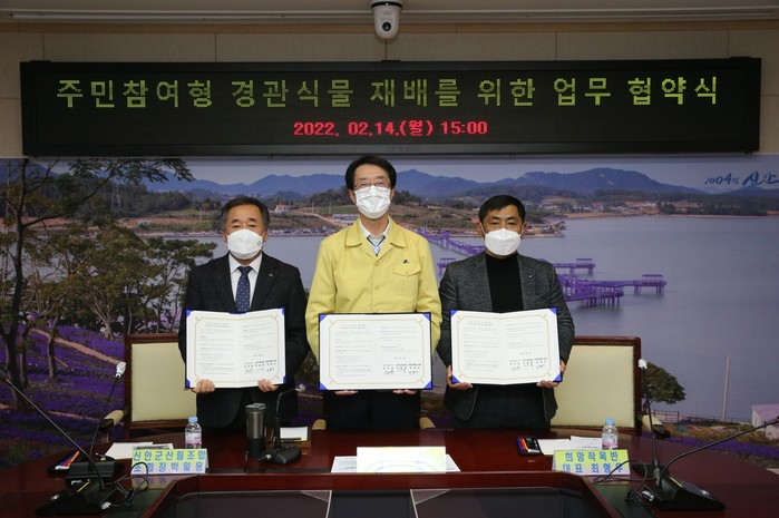 [세계로컬타임즈 조문배 기자] 신안군은 신안군산림조합(조합장 박일용), 희망작목반(대표 최형우)과 공동으로 도초면 지남리 일대에 '주민참여형 경관식물 재배'를 위한 육묘자원의 재배·관리에 관해 업무협약을 맺었다.