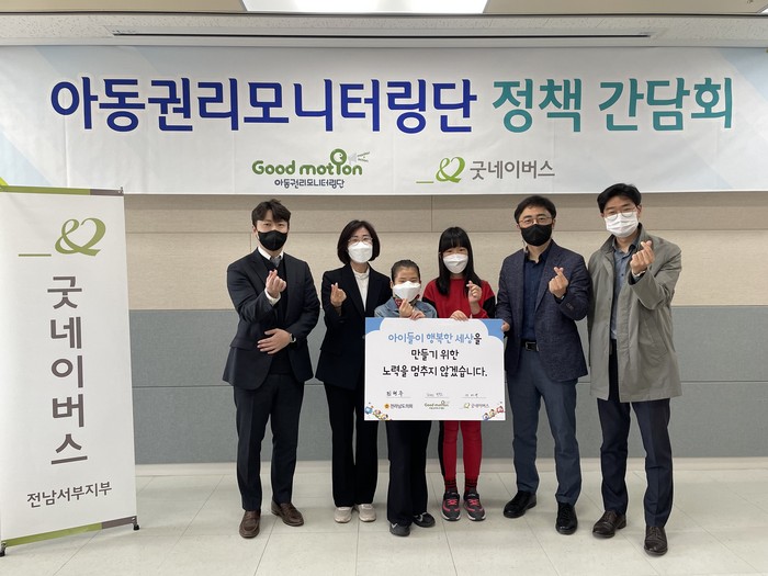 [세계로컬타임즈 김명진 기자] 굿네이버스 전남서부지부(지부장 임광묵), 전남중부지부(지부장 유기용), 전남북부지부(지부장 강성규)는 전라남도의회, 전남권역 아동권리모니터링단 굿모션(Good motion)과 함께 아동 참여권 보장을 위한 정책 간담회를 진행했다고 12일 밝혔다.