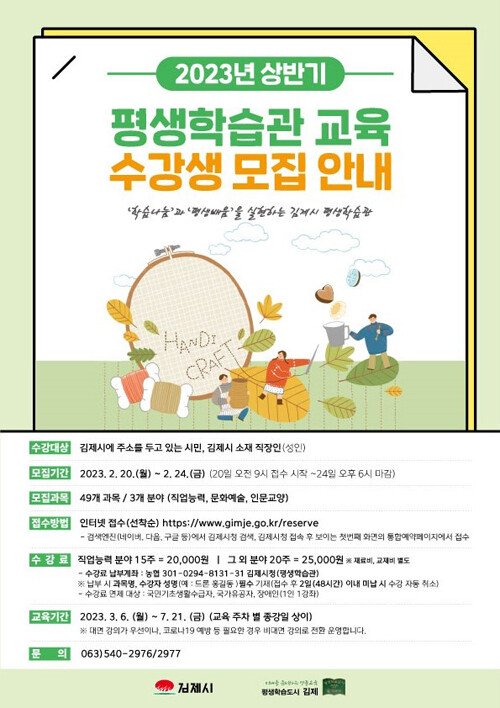 [세계로컬타임즈 조주연 기자] 전북 김제시가 “3월 6일부터 7월 21일까지 20주 과정으로 진행되는 2023년도 상반기 평생교육 프로그램의 수강생을 모집한다”고 13일 밝혔다.