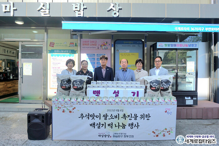 [세계로컬타임즈 조주연 기자] 전북 부안 마실밥상조합이 8일 부안군에 33만 원 상당 백설기떡 40kg을 기탁했다.