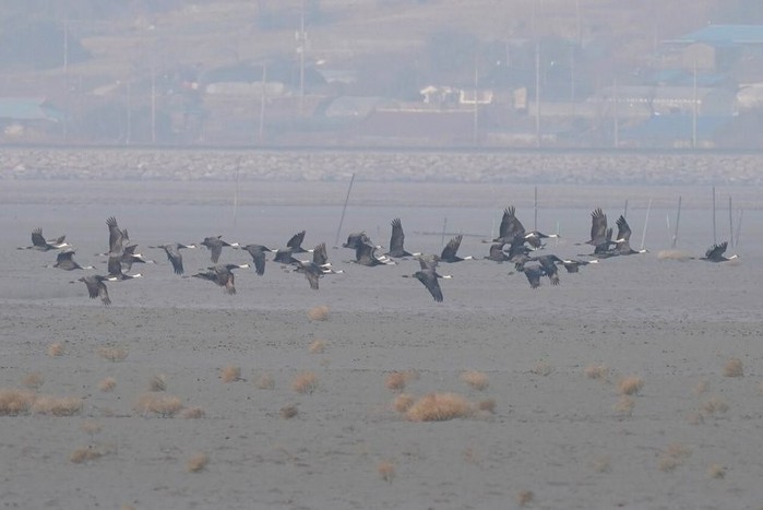 지난 14일 지도갯벌을 찾은 흑두루미 52개체가 확인됐다. 흑두루미는 전세계 개체군 대부분이 이즈미에서 월동하는데, 번식지로 북상하기 위해 이동하던 무리가 먹이활동과 휴식을 위해 신안갯벌을 찾은 것으로 보인다.