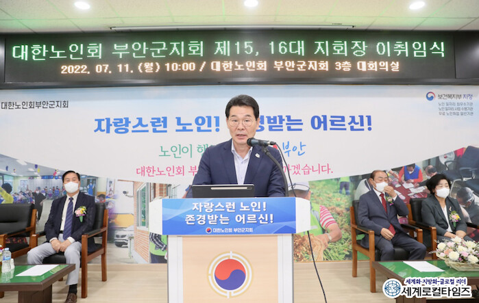 [세계로컬타임즈 조주연 기자] 대한노인회 전북 부안군지회가 11일 제16대 김성태 지회장 취임식을 개최했다