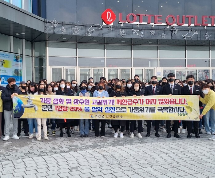 [세계로컬타임즈 박종현 기자] 전남 무안군(군수 김산)은 지난 23일 남악 롯데아울렛에서 군민들에게 가뭄의 심각성을 알리고, 군민 1인당 20% 물 절약 실천을 호소하는 물 절약 가뭄 극복 캠페인을 진행했다.