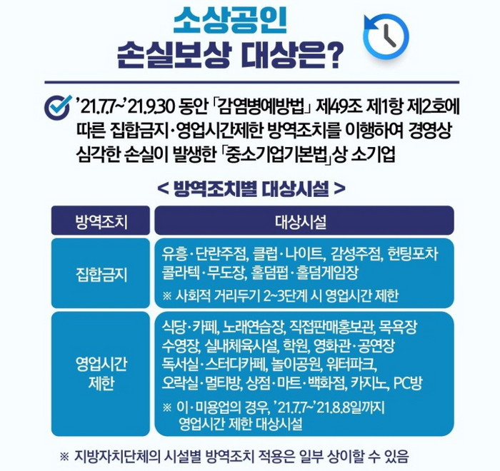 손실보상 대상은 올해 7월 7일부터 9월 30일 기간 동안 코로나19로 인하여 집합 금지나 영업시간 제한 조치를 받아 경영상 손실이 발생한 소기업 및 소상공인 등 1만8000여개 사업체다.
