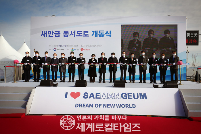 | ▲새만금 동서도로 개통식이 열리고 있다. (사진=정운천 의원실 제공) |