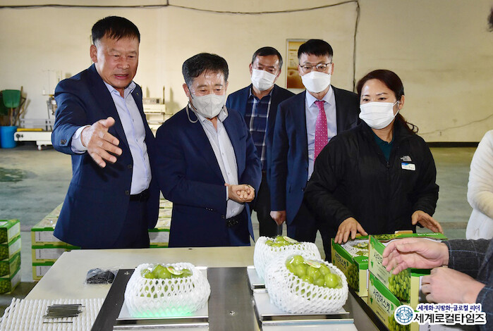 [세계로컬타임즈 조주연 기자] 전북 김제에서 생산된 샤인머스켓 포도가 싱가폴과 말레이시아 수출 길에 올랐다.