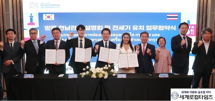 이날 관광설명회에는 전남 관광환경 소개에 이어 김영록 지사, 박인규 ㈜세운트래블 대표, 벤야파 뿐왓타시티 플런플런 투어 대표, 김명진 ㈜제주항공 방콕지점장 등이 참석한 가운데 방콕 전세기 업무협약을 했다.