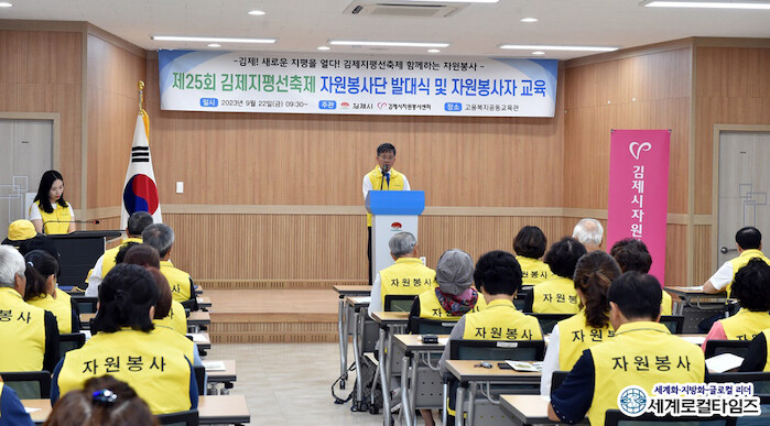 김제시에 따르면 이날 고용복지공동교육관에서 정성주 시장, 김영자 시의장을 비롯한 120여 명의 자원봉사자들이 참석한 가운데 ‘제25회 김제지평선축제 자원봉사단 발대식 및 교육’이 진행됐다.