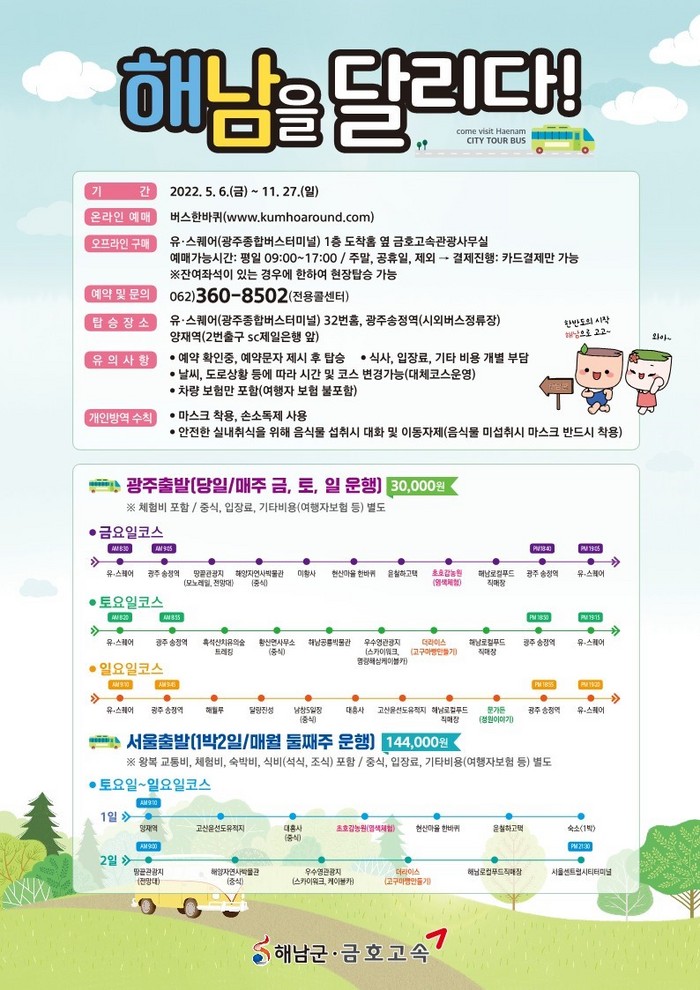 한편 시티투어버스는 매주 금, 토, 일요일에 광주 유·스퀘어에서, 매월 둘째주 토요일~일요일에 서울 양재역에서 출발해 해남 곳곳을 투어한다. 이용요금은 광주 출발 3만원(체험비 포함, 입장료·중식비 별도), 서울 출발 14만4,000원(체험비·석식·조식·숙박비 포함, 입장료·중식비 별도)이며, 코스와 요금 등 자세한 사항은 포털에서 ‘버스한바퀴’를 검색하거나 금호고속 전용콜센터로 문의하면 된다.