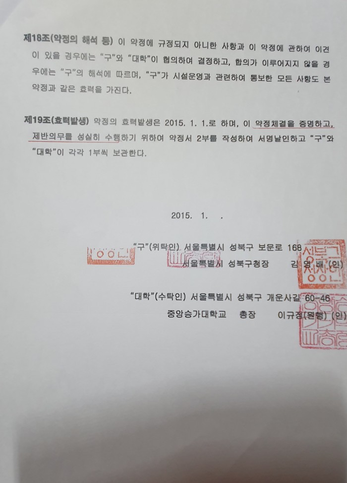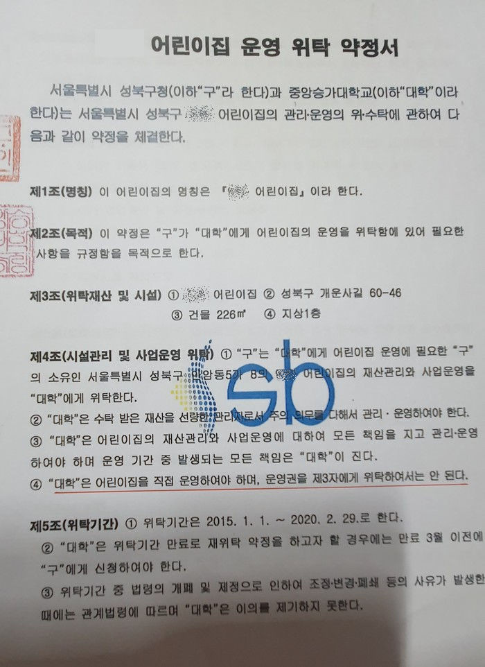 제14조(수탁자의 의무)3항에는 “대학”은 “구”의 승인 없이 권리의 양도, 대여 등의 행위를 할 수 없다. 제16조(약정의 해지)1항 “구”는 다음 각 호에 해당하는 사유가 발생하였을 때에는 이 약정을 해지할 수 있다. 위탁체 및 어린이집과 관련하여 다수의 민원이 발생되는 등 사회적 물의를 일으킨 때라고 명시 돼 있지만 성북구는 위 위반 사항들을 인지하고 사회적 물의를 일으키고 있지만 아무런 조치를 못하고 있다.