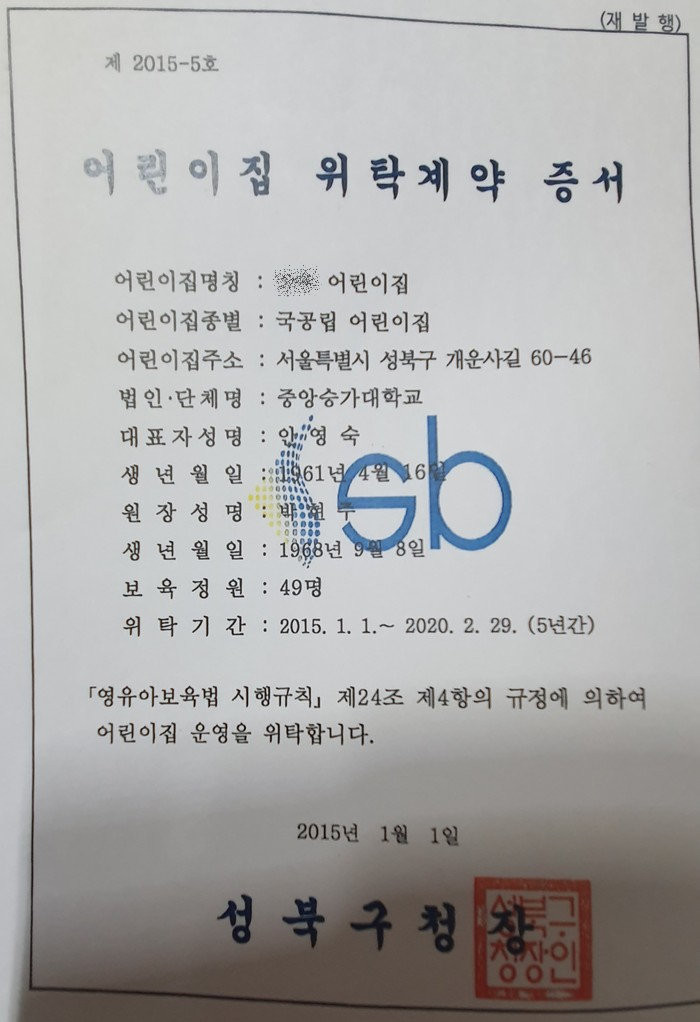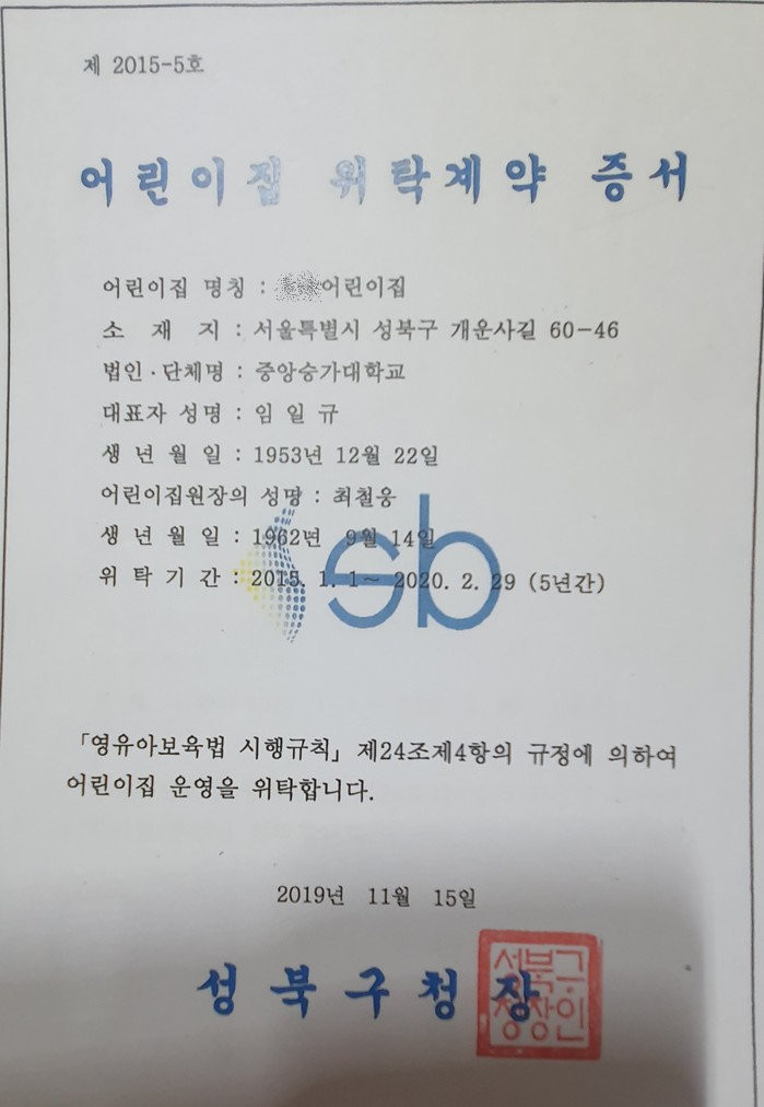 | ▲어린이집위탁계약증서가 이규정(원행)으로 발행했다. |