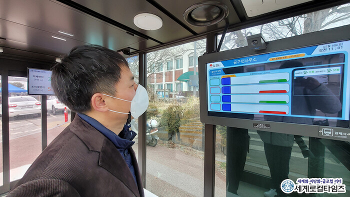 | ▲2021년 2월 6일 오상민 김제시의원이 한 정류장에서 버스정보시스템을 살펴보고 있다. (세계로컬타임즈 DB) |