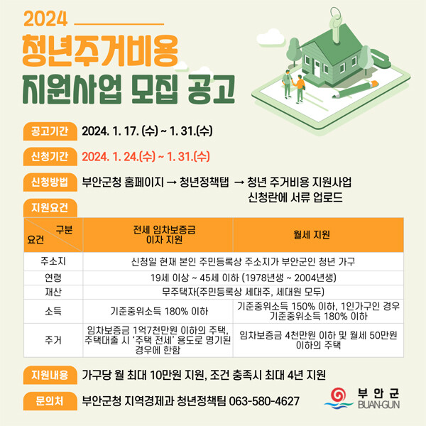 [세계로컬타임즈 조주연 기자] 전북 부안군이 “청년들의 주거 및 생활안정을 지원하고자 2024년 청년 주거비용 지원사업 참여자를 24일부터 31일까지 모집한다”고 18일 밝혔다.