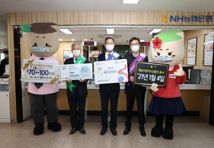 | ▲해남사랑상품권 카드형 출시(좌로부터 김병덕 해남군의회 의장, 명현관 해남군수, 김상보 NH농협은행해남군지부장) (사진=해남군) |