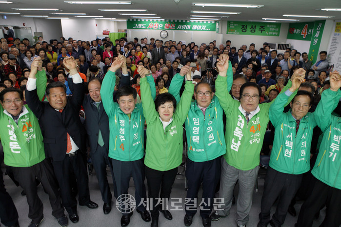 김제시장 당내 경선을 포기하고 정성주 예비후보 돕기에 나선 강병진 선대본부장은 환영사를 통해 "지방자치가 시행된 지 수십 년이 됐지만 김제시는 총체적인 위기상황에 직면해 있다"면서 "이런 위기사항을 극복하기 위해 강력한 리더십과 카리스마를 가지고 있는 젊은 시장을 원하고 있다"고 목소리를 높였다.