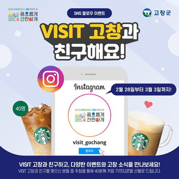 이를 기념하기 위해 SNS 개설 이벤트도 오는 3일까지 진행한다. 참여 방법은 페이스북 ‘Visit Gochang’ 과 인스타그램을 팔로잉하고 댓글에 ‘이벤트 참여한다’는 문구를 작성하게 되면 추첨을 통해 당첨된 사람에게 기프티콘을 지급하는 방식이다.