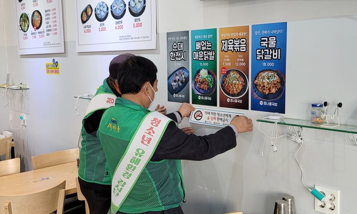 또한 학교 인근과 유해업소 밀집지역의 청소년 유해광고물 정비는 물론 음식점, 편의점, 술집 등을 대상으로 ‘만 19세 미만 청소년에게 술‧담배 판매 금지’ 스티커를 배포하는 등 청소년 유해환경 개선을 위해 적극적인 홍보활동을 실시했다.