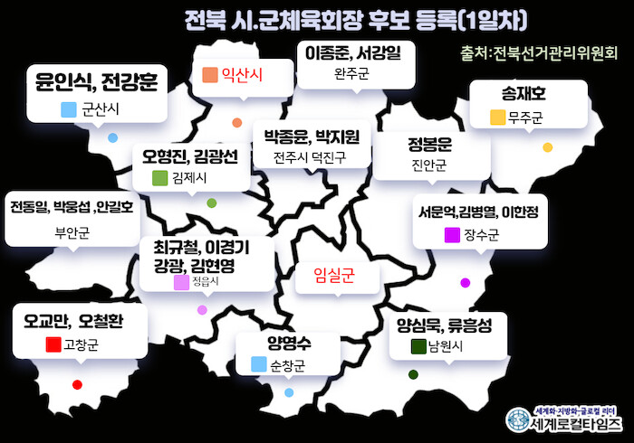▲완주군 이종준 현 완주군 체육회장, 서강일 완주군 체육회 부회장 ▲무주군 송재호 현 무주군 체육회장 ▲진안군 정봉운 현 진안군 체육회장 ▲장수군 서문억 전 장수군 축구협회장, 김병열 현 장수군 체육회장, 이한정 장수군 체육회 부회장 ▲순창군, 양영수 현 순창군 체육회장 ▲고창군 오교만 현 고창군 체육회장, 오철환 고창군 유도협회장 ▲부안군은 전동일 전 부안군 골프협회장, 박웅섭 전 부안군 축구협회장, 안길호 현 부안군 체육회장이 후보자로 등록했다.