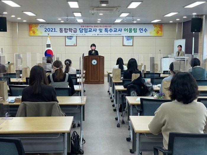 | ▲무안교육지원청은 지역 유‧초‧중‧고 통합학급 담임교사 및 특수교사를 대상으로 함께 만들어가는 행복한 특수교육을 주제로 연수를 실시했다.(사진=무안교육지원청) |