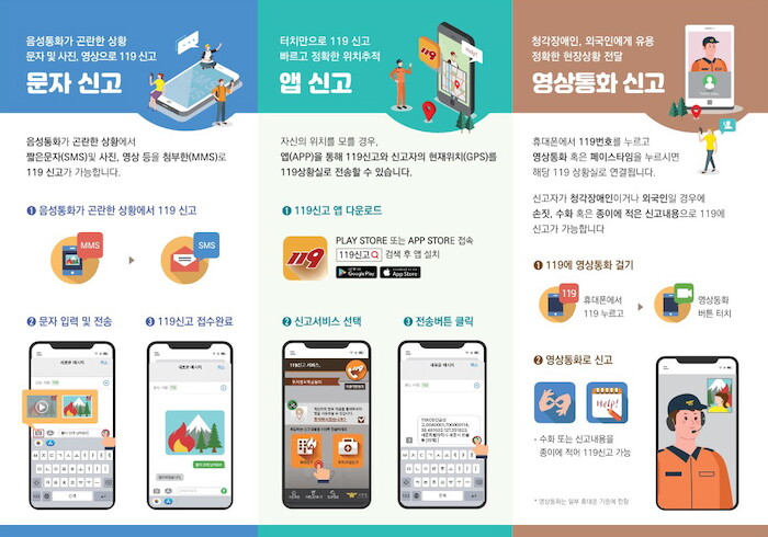 앱을 통한 신고는 ‘119신고’ 앱을 설치한 후 신고 서비스를 선택해 전송하면 GPS 위치정보가 119상황실로 전송돼 신고자의 정확한 위치 확인이 가능하다. 특히, 산이나 바다, 고속도로 등 재난 위치를 정확히 알지 못하는 상황에 특히 유용하다.