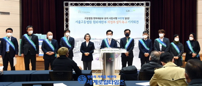 [세계로컬타임즈 글·사진 신선호 기자] 안병용 의정부시장은 서울고등법원 원외재판부 유치를 위한 시민 16만 명의 서명과 함께 대법원에 원외재판부 설치를 촉구했다.