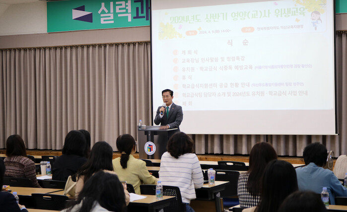[세계로컬타임즈 조주연 기자] 전북 익산교육지원청이 9일 오후 유치원·학교급식 영양교사를 대상으로 한 위생교육을 가졌다.