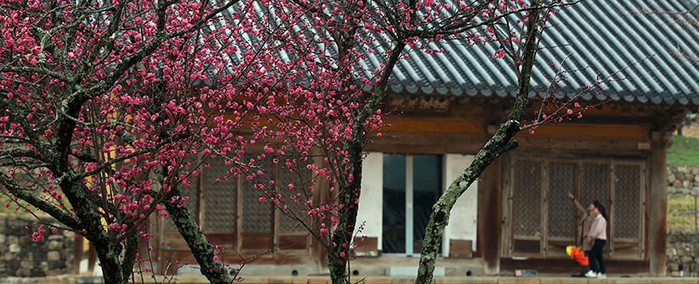 [세계로컬신문 이남규 기자] 19일 전남 강진군 성전면 월하리에 위치한 천년고찰 무위사 극락보전(국보 제13호) 마당에 차분히 내리는 봄비를 벗삼아 홍매화가 붉은 꽃망울을 활짝 터트린 모습.